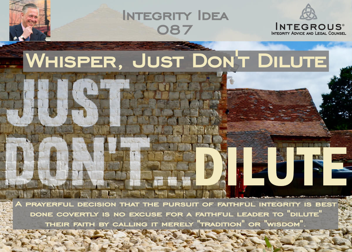 INTEGRITY IDEA: Whisper, Just Don't Dilute "Whisper, Just Don't Dilute" is about a faithful leader being courageous in sharing as TRUTH (and not merely as "wisdom" or "tradition") the faith that informs their leadership and inspires the bigger WHY of the organization, even if the leader has discerned that it is wiser stewardship for the organization to "whisper"--operate at the covert...
