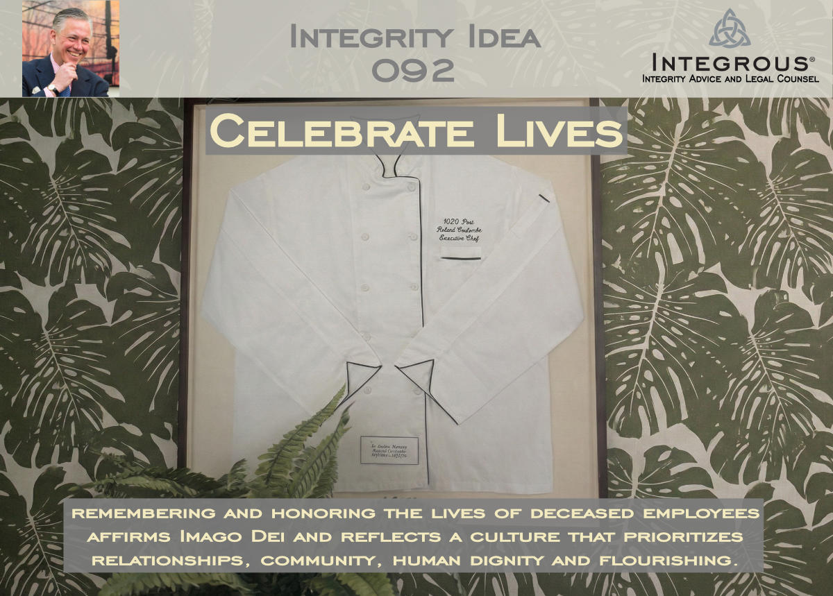 INTEGRITY IDEA: Celebrate Lives "Celebrate Lives" is about a faithful leader implementing practices that intentionally remember, honor and celebrate members of the organization who have died. It recognizes the Imago Dei in those departed--dignity that does not end at death--as well as the importance of relationships built in the workplace. In doing so, it reflects and reinforces a business a better...