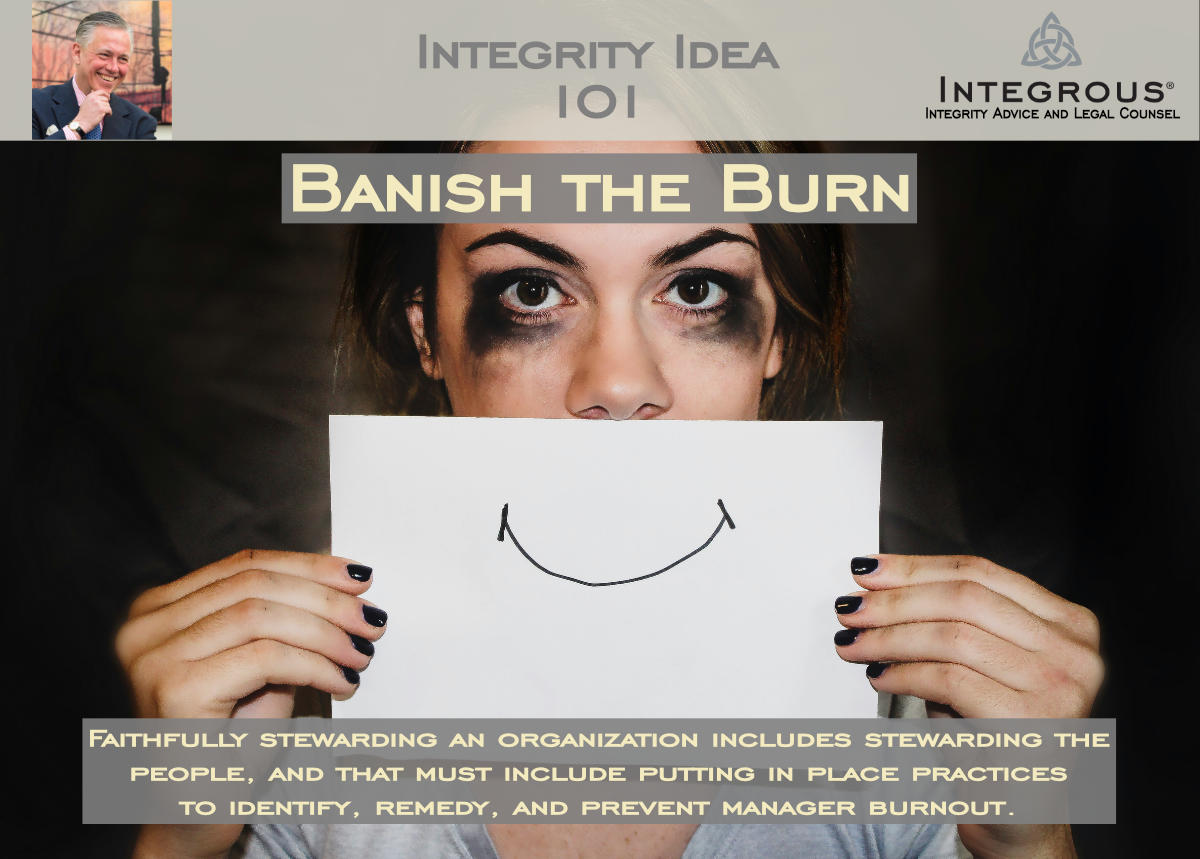 INTEGRITY IDEA: Banish the Burn Recently Fast Company published a series of articles on a growing crisis of manager "burnout". "Banish the Burn" is about a faithful leader putting in place practices to identify potential manager burnout, understand its sources, care for managers experiencing burnout, and cultivate an organizational culture designed to minimize the causes of and proactively protect against burnout. ...